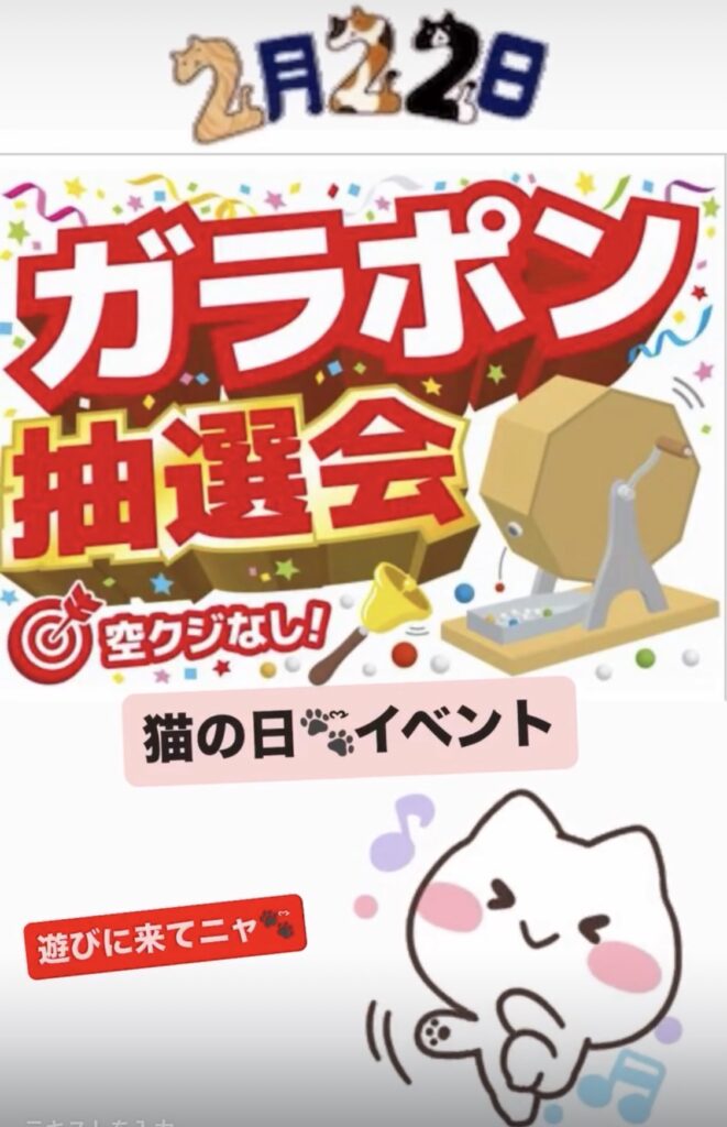 2月22日(日) ニャン・ニャン・ニャン🐾໊猫の日に、ガラポン抽選会を開催します♪是非遊びに来てください!何が当たるかは、お楽しみ♪です😁