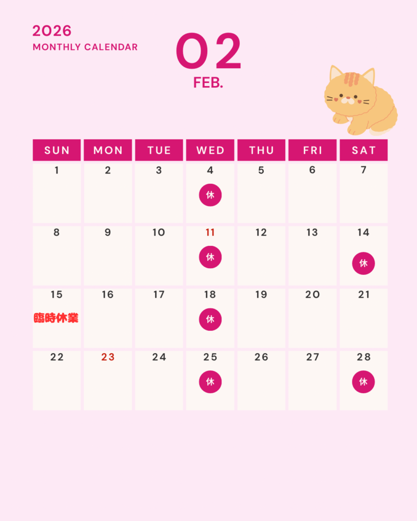 2月の予定になります♪よろしくお願いします。2/15(日)は臨時休業となりますので、ご了承下さい🙇🏻♀️寒さが厳しくなってきました。体調に気をつけてお過ごし下さい!猫さん達は暖房の効いたぬくぬくのホカペにて寝ておられますよー。気軽に遊びに来て下さい!可愛い💕猫さん達とお待ちしてます😊