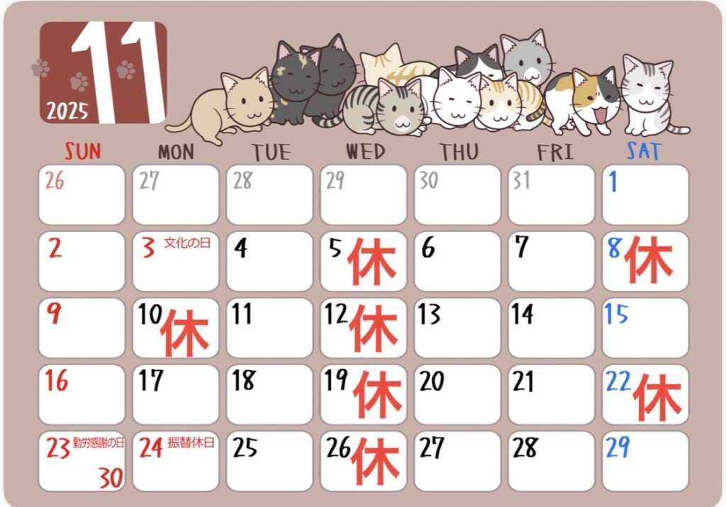 10月もたくさん遊びに来て頂きありがとうございました😊11月の予定になります♪10日(月)は臨時休業となります🙇🏻♀️よろしくお願いします。朝晩はすっかり寒くなってきたので、体調管理に気をつけてお過ごしください!猫さん達は、暖かいお部屋でホカペでぬくぬく寝ておられます🤭お気軽に遊びに来て下さいね♪お待ちしてます
